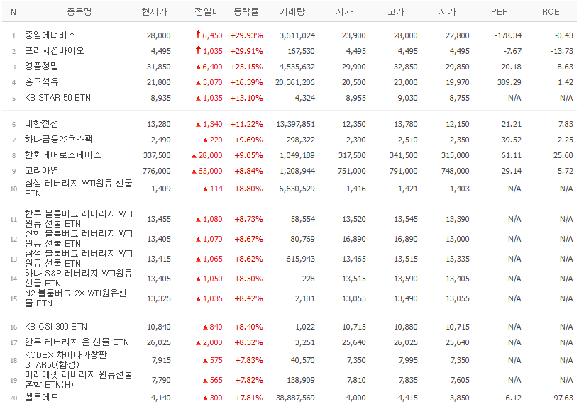 갭상승 종목중에서 전일 고가보다 당일 저가가 높은 종목 Top 20 (24.10.04(금) 종가기준)
