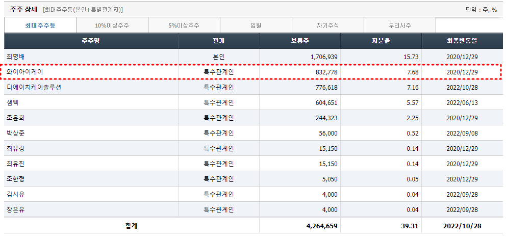 삼성전자는 20년도에 이미 와이아이케이의 11.70% 지분을 확보하면서 2대 주주로 등극되어 있다. 최근 삼성전자가 레인보우로보틱스 지분을 인수하면서 주가가 많이 상승하였고, 삼성이 건들면 주가가 2~3배 이상 상승할 것이라는 기대감이 시장에 여전히 남아 있다.