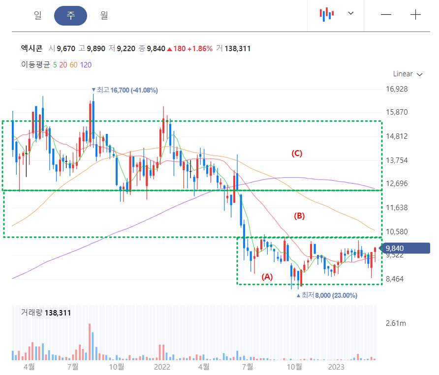 (2) 엑시콘 주봉 차트분석