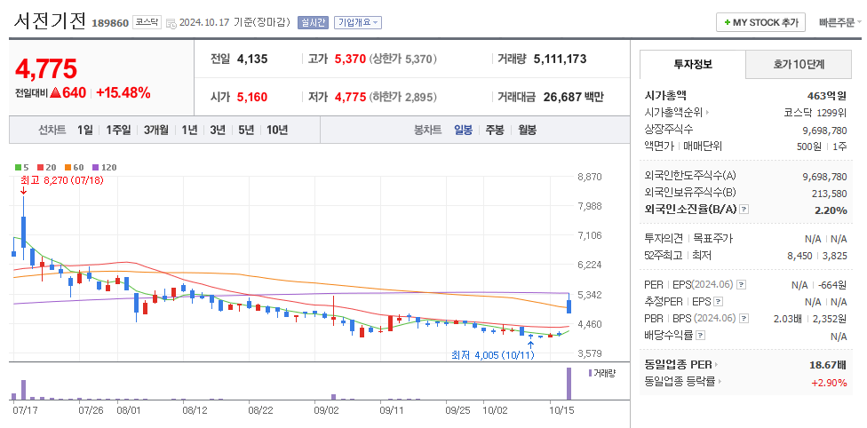 | 서전기전 | 4,775 | +15.48% | 266억 7,200만 | 수배전반 생산업체. 수전반, 배전반 설비 및 전력기기 생산. |