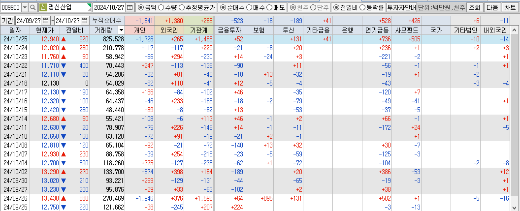 명신산업 투자자별 매매동향을 보면, 최근 2거래일 연속 연기금이 들어온 것을 알 수 있으며, 지난 금요일(10/25)에는 개미들의 물량을 외국인과 기관이 서로 나눠가진 것을 알 수 있는데, 현재로서의 세력주체는 기관이라 볼 수 있다. 따라서 기관 수급을 잘 체크해두도록하자.