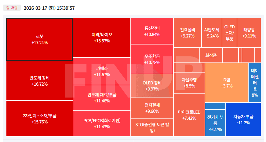 안녕하세요!여러분들의 주린이 탈출을 돕기위한 탈출작전의 리더 차트충입니다.요즘같이 불확실하고 어려운 시장에서도 살아남기위해, 차트충이 열심히 핫한 섹터를 발굴해보도록 하겠습니다.자, 주린이 탈출작전 시작합니다.26.03.17(화) 오늘의 테마동향 및 특징주 정리 > 주식 정보 공유를 위한 목적으로 톡방을 만들었습니다.가장 빠른 최신 기사 및 좋은 주식정보, 관심종목 등도 장중에 제공하니 하기 링크로 들어와 확인하세요~ (무료)https://open.kakao.com/o/g9auN6vf 차트충의 주린이탈출작전#차트충 #주린이 #주린이탈출작전 #주식 #주식정보 #뉴스정보 #종목추천 #차트분석 #투잡 #재테크 #블로그 #시황open.kakao.com1:1문의:https://open.kakao.com/o/sV4..